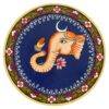 This hand-painted pichwai wall plate features Ganesha, the Hindu god of wisdom and prosperity. He is depicted with a flower on a blue plate, surrounded by flowers and a horse. The intricate details and vibrant colors make this a beautiful piece of art for any home.